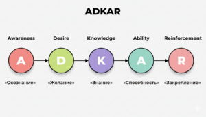 Модель ADKAR (основа — пять шагов готовности человека к переменам): Осознание смысла → Желание участвовать → Знание что и как делать → Способность реально выполнять → Подкрепление нового поведения.