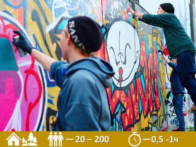 Огромная картина или граффити — вот результат этого интерактива. Это может быть свободное творчество участников или набросок нашего художника, который участники будут трансформировать по своему желанию.