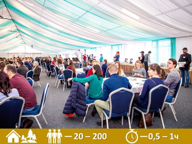 Этот формат хорошо проводить на конференциях, партнерских и командообразующих мероприятий. Подойдет welcome time или длительность всего мероприятия.